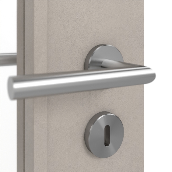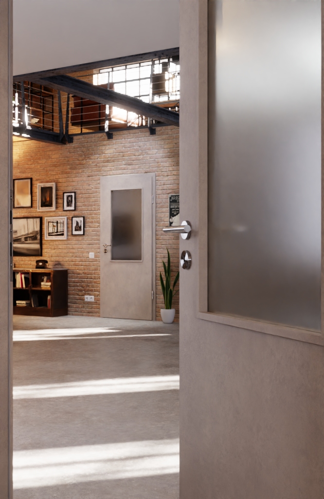 Prostokątne skrzydło drzwi wyposażone jest w rdzeń z płyty wiórowej oraz 3 mm grubą warstwę wierzchnią. Solidny charakter znajduje odzwierciedlenie w klasie obciążenia S. Oprócz zamka wielozadaniowego, w standardowym wyposażeniu znajdują się dwuczęściowe zawiasy.