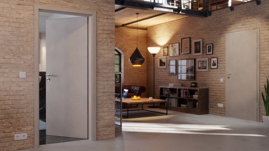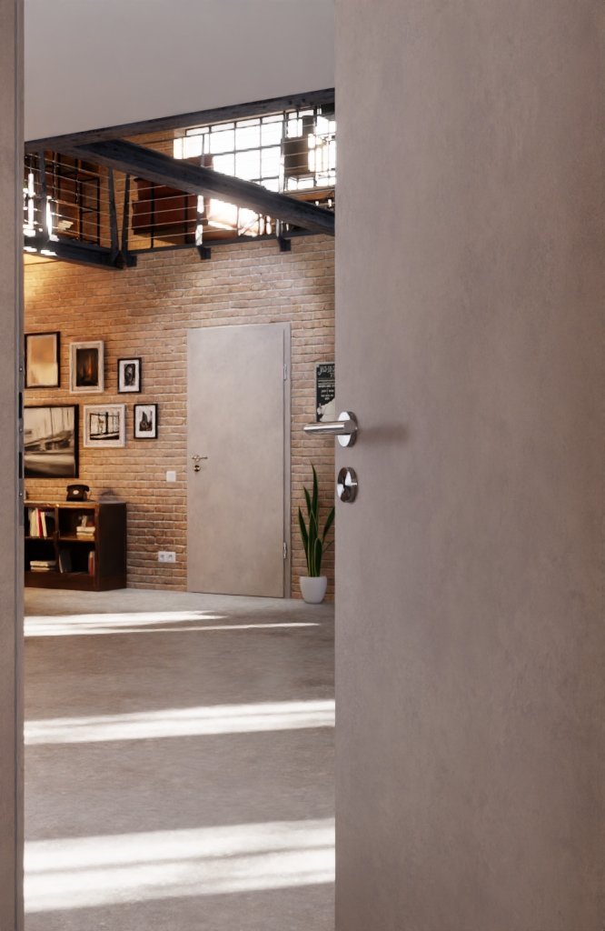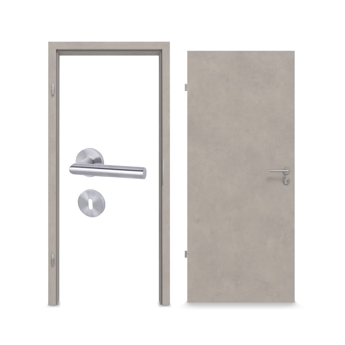 Zakupy w komfortowych warunkach: komfortowy zestaw drzwi wewnętrznych w kolorze Semento od Westag wyróżnia się praktycznością, ponieważ obejmuje skrzydło drzwiowe, ościeżnicę i klamkę.