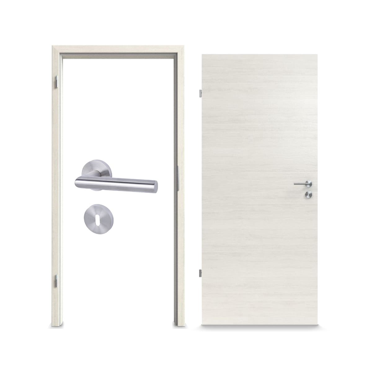 Komfortowy zestaw: Zestaw drzwi wewnętrznych w białym pinie Cross od Westag wyróżnia się praktycznością, ponieważ zawiera skrzydło drzwiowe, ościeżnicę i klamkę.