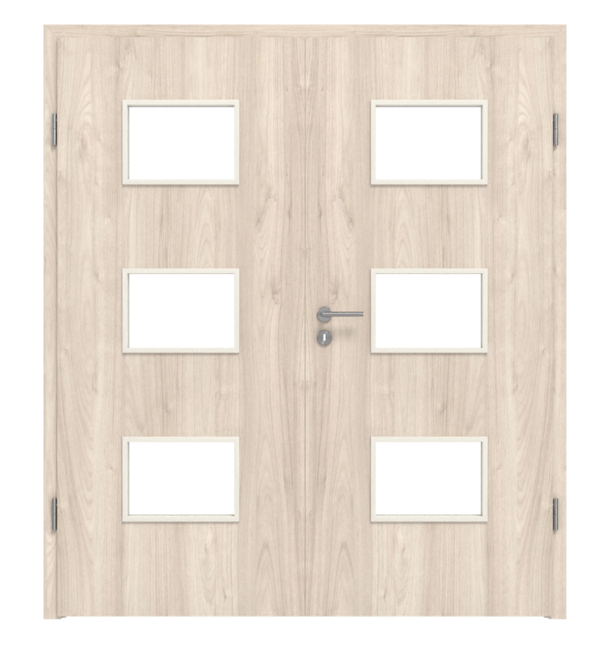 Płyta wiórowa w rdzeniu zwiększa stabilność obu skrzydeł drzwiowych. Solidne wykończenie zapewnia 3 mm grubości płyta wierzchnia. Dzięki trójczęściowym zawiasom skrzydła drzwiowe są niezawodnie osadzone w dostarczonej ościeżnicy. Już w standardzie otrzymujesz uchwyty zawiasowe, zaczep zamka i uszczelkę ościeżnicy.