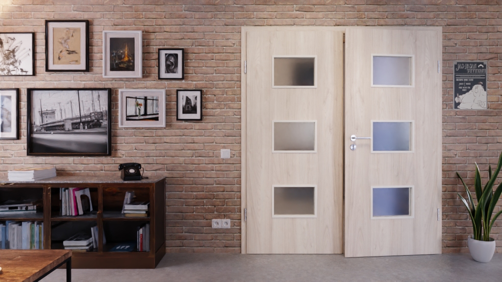 Na skrzydle drzwi znajduje się brązowy dekor drewniany. Dzięki odporności na ścieranie, zarysowania i uderzenia możesz się nim cieszyć przez długi czas. Łatwa pielęgnacja zapewnia odporność na rozpuszczalniki i wilgoć. Dzięki trzem przeszkleniom do Twojego domu wpada światło.