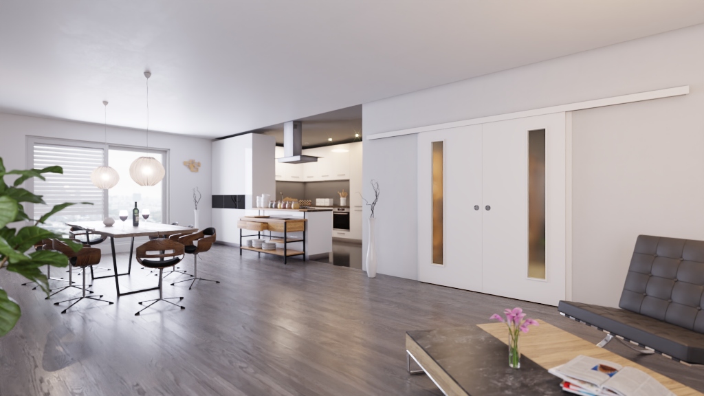 Imponująca koncepcja drzwi: Podwójne drzwi przesuwne LA-1B w Arctic White A 222 PortaLit od Westag tworzą otwartą atmosferę w Twoim domu.