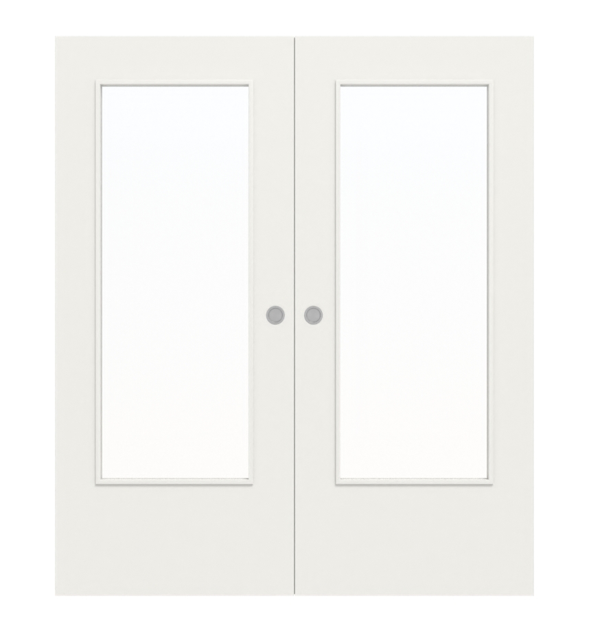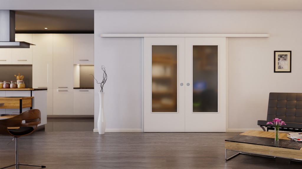 Podwójne drzwi przesuwne charakteryzują się centralnym przeszkleniem w każdym skrzydle. Wygląd dopełnia bardzo jasny odcień w RAL 9016, który nadaje powierzchni lakierowanej kolor biały.