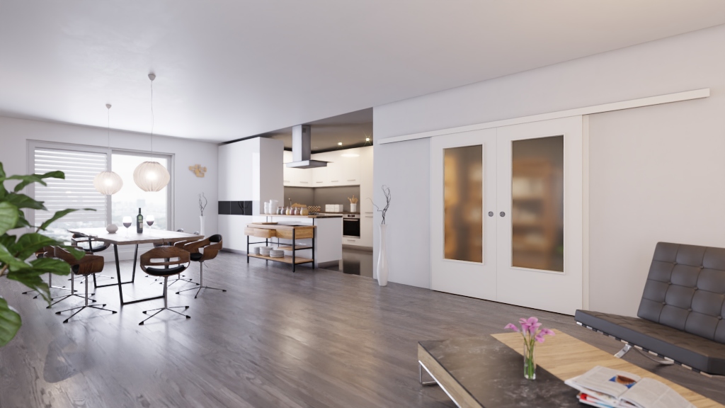Drzwi przesuwne z dwoma skrzydłami w kolorze Arctic White (RAL 9016) od Westag: