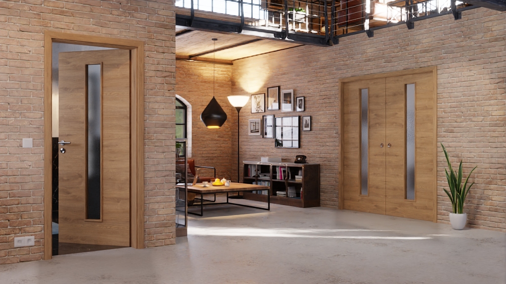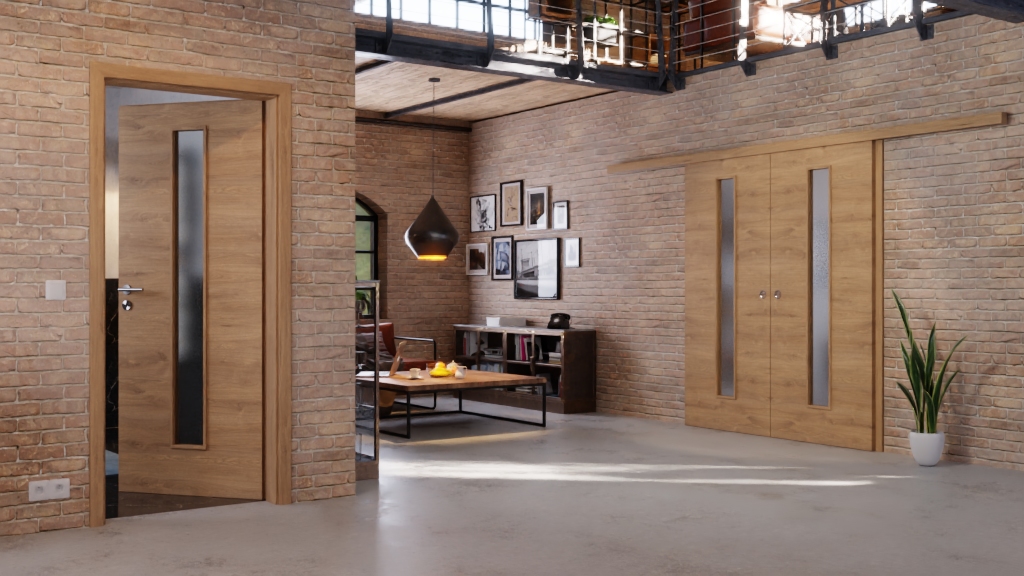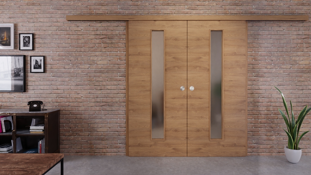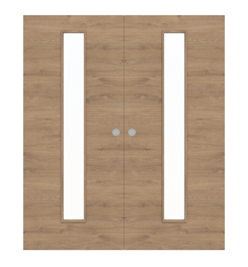 Na środku obu skrzydeł drzwi znajduje się wąski pas światła, który zdobi gładką powierzchnię CPL. W połączeniu z ciemnym dekorem dębowym design podwójnych drzwi przesuwnych robi szczególne wrażenie.