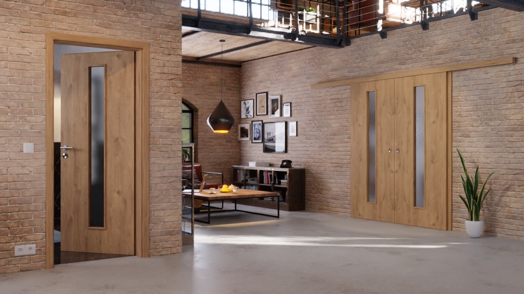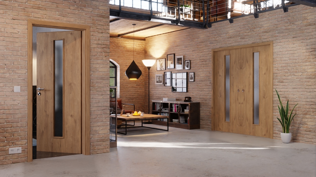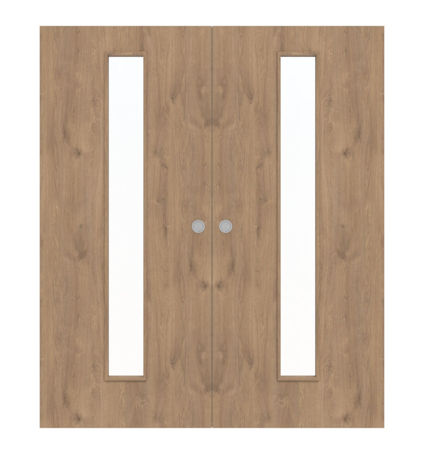 Usłojenie drewnianego dekoru w dębie nadaje surowy wygląd gładkiej powierzchni CPL. Pośrodku dwóch skrzydeł drzwiowych cienkie pasy świetlne wpuszczają do Twoich pomieszczeń światło.