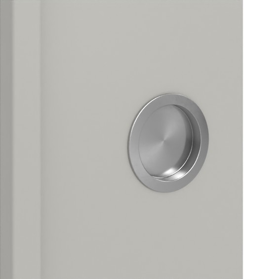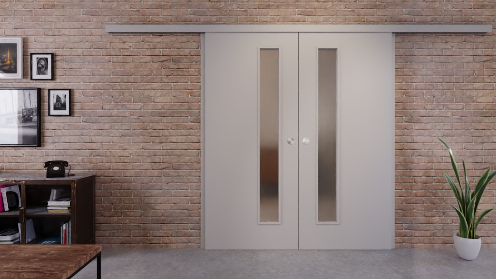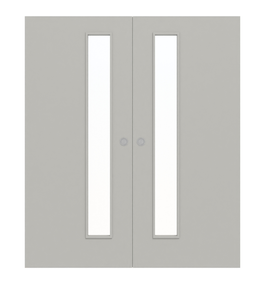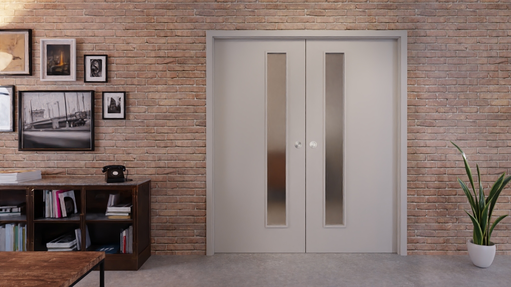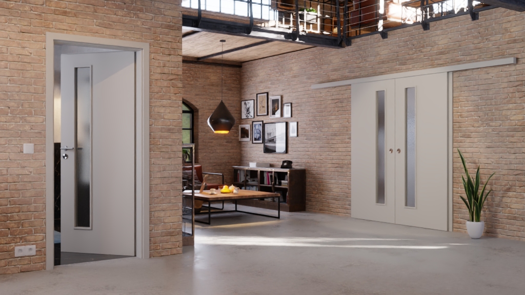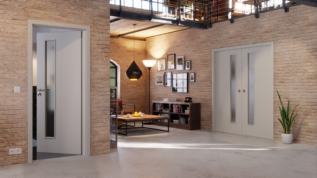 Gładka powierzchnia CPL zachwyca jasnoszarym wykończeniem. Po stronie zamka cienkie i wydłużone ramki szklane zdobią oba skrzydła drzwi.