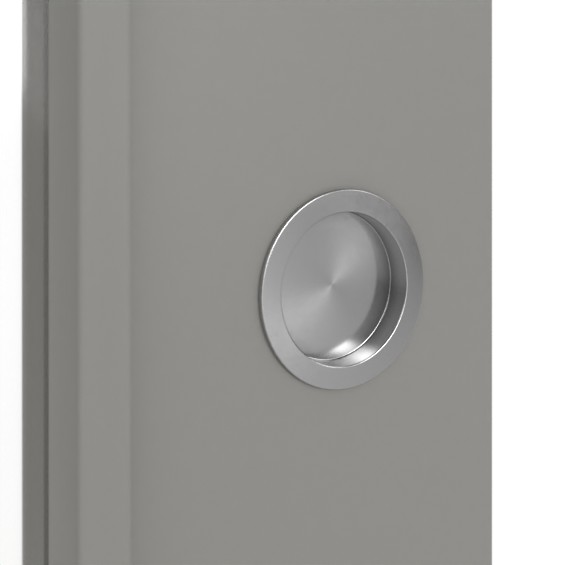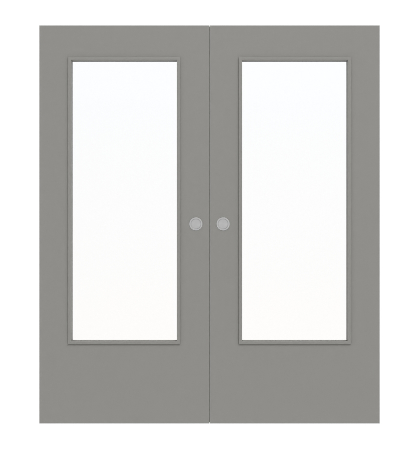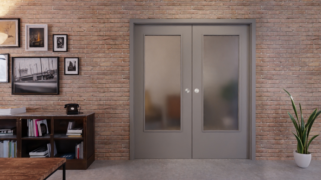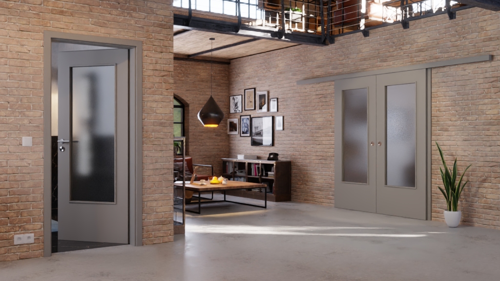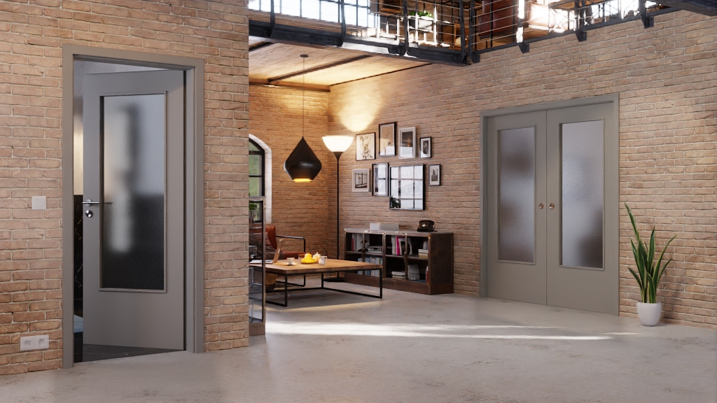 Gładka powierzchnia CPL jest w szarym kicie. Każde skrzydło drzwi ma prostokątny otwór szklany. Spójny ogólny wygląd jest dyskretny i ponadczasowy.