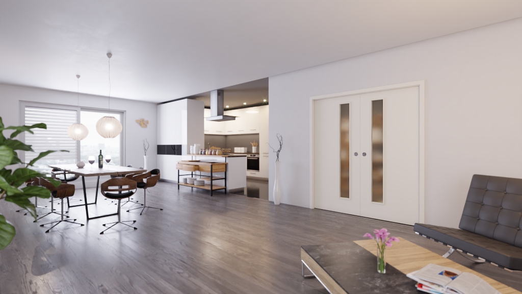 Jasne perspektywy: Te podwójne drzwi przesuwne LA-1D w klasycznej bieli RAL 9010 od Westag to prawdziwy cud przestrzeni, który zapewnia więcej miejsca w Twoim domu.