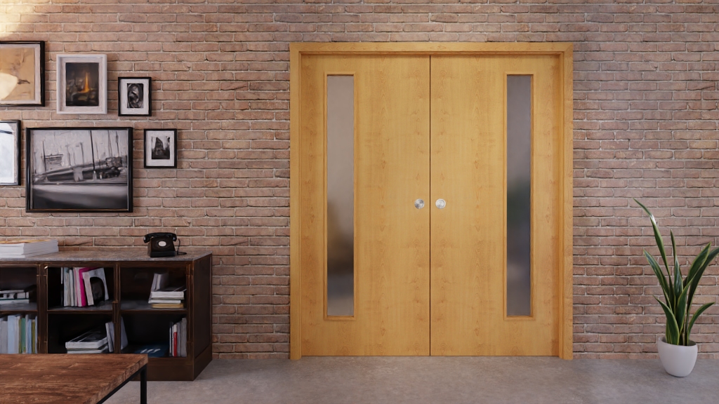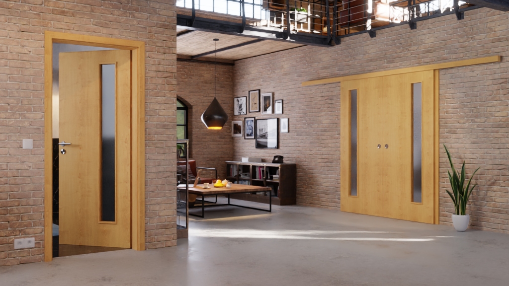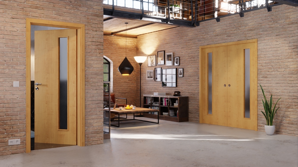 Światło boczne po jednej stronie skrzydła drzwi strukturyzuje gładką powierzchnię CPL. Rustykalny dekor klonu zachwyca naturalnym drewnianym klimatem.
