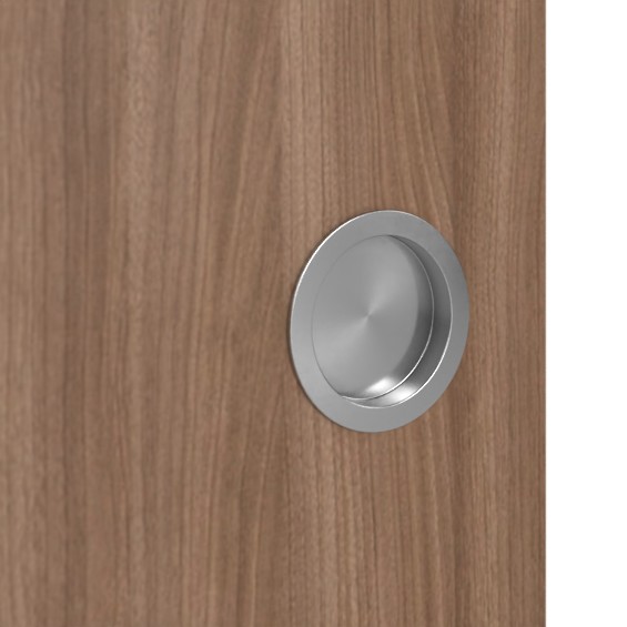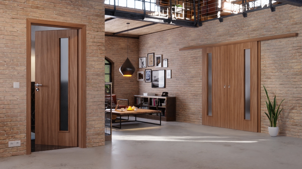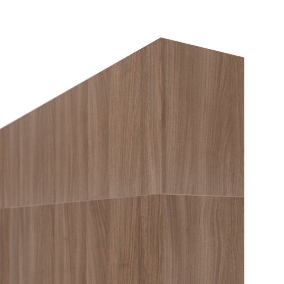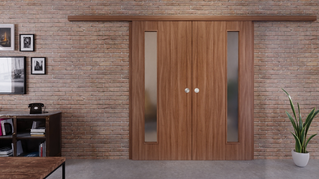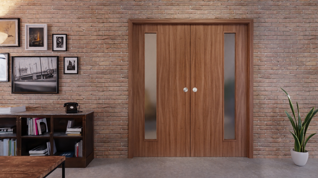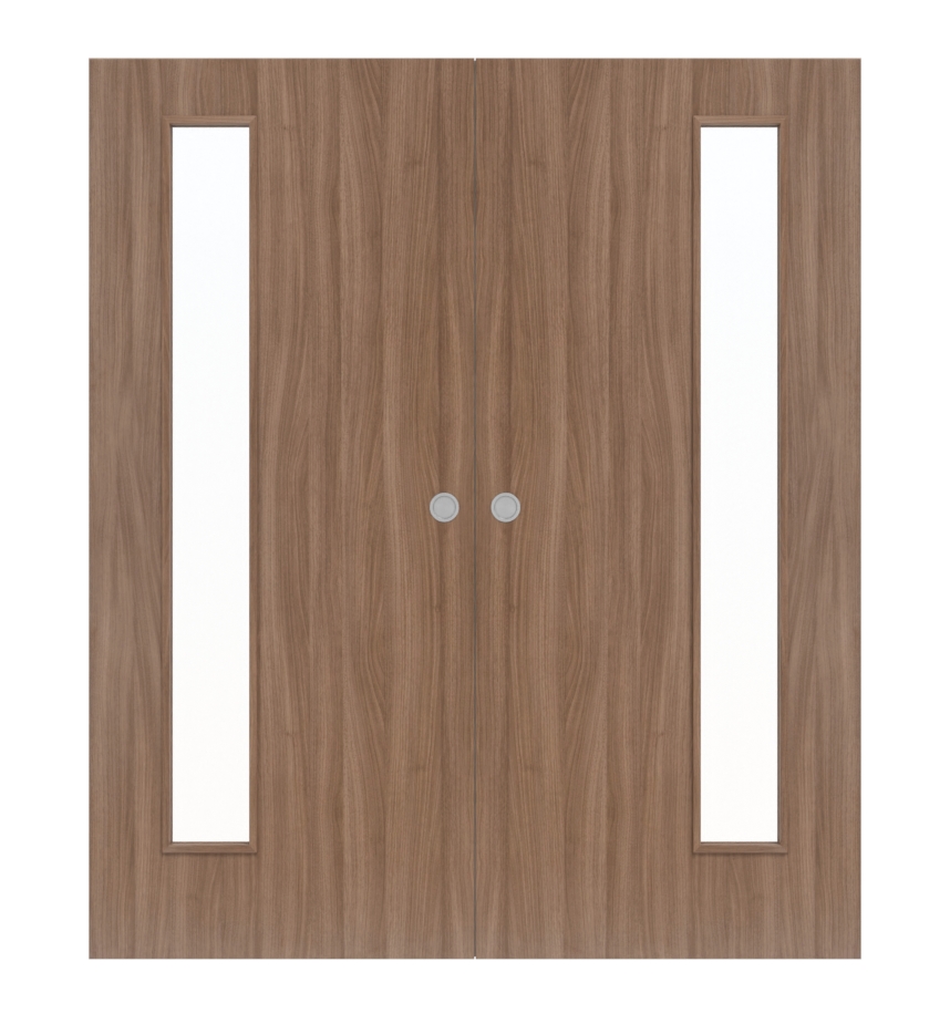 Po stronie zawiasów każde skrzydło zdobi wąski kanał świetlny na gładkiej powierzchni CPL. Cudowna ciemna dekoracja drewna w orzechu zdobi podwójne drzwi przesuwne z autentycznymi słojami.