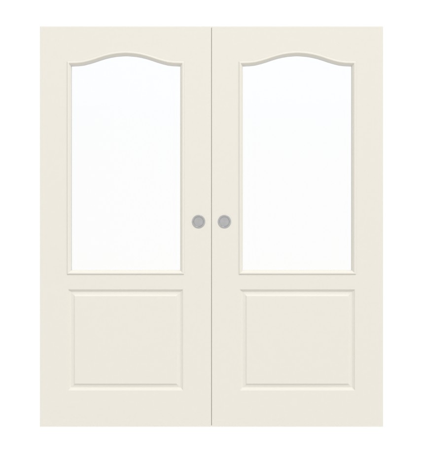 Każde skrzydło drzwi składa się z szklanej ramy z łukiem w górnej części. Dolna część wyposażona jest w kwadratową kasetę drewnianą. Doskonale ustrukturyzowany wygląd powierzchni lakieru na biało dopełnia jasna optyka.