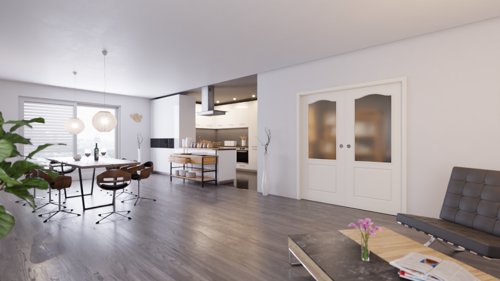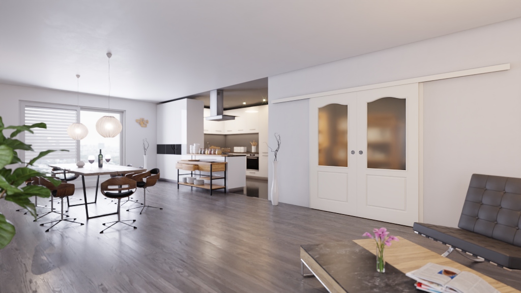 Jasne perspektywy: Podwójne skrzydło drzwi przesuwne Provence Typ 4002-B-LA w klasycznej bieli RAL 9010 lub bieli arktycznej RAL 9016 od Westag to prawdziwy cud przestrzeni, który zapewnia więcej miejsca w Twoim domu.