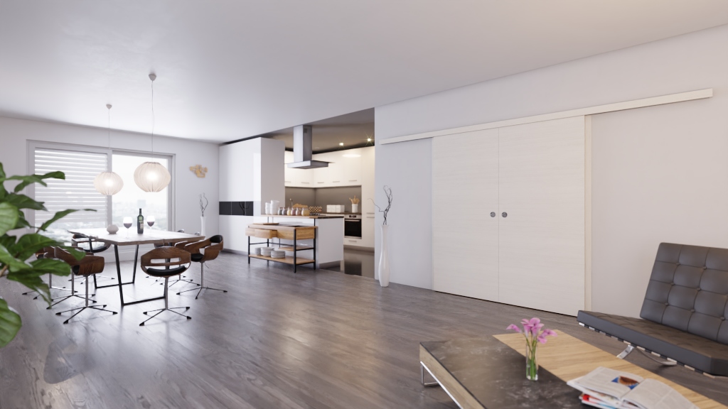 Wybierając te podwójne drzwi przesuwne, stawiasz na bezbarierowe mieszkanie i inkluzywną koncepcję przestrzeni dzięki łatwej obsłudze. Powierzchnia CPL jest wytrzymała i odporna. Łatwość w pielęgnacji i odporność na ścieranie idą w parze.