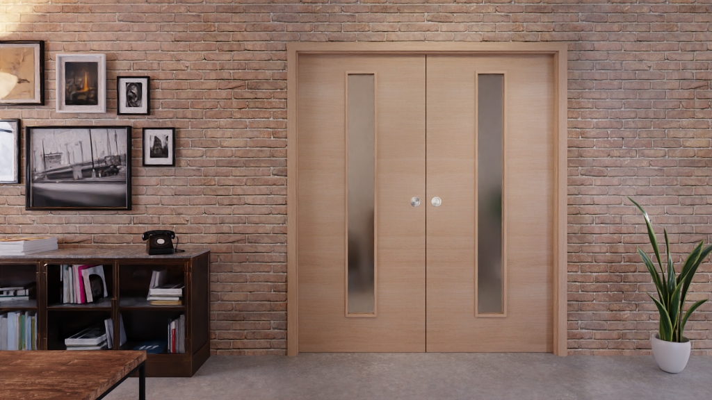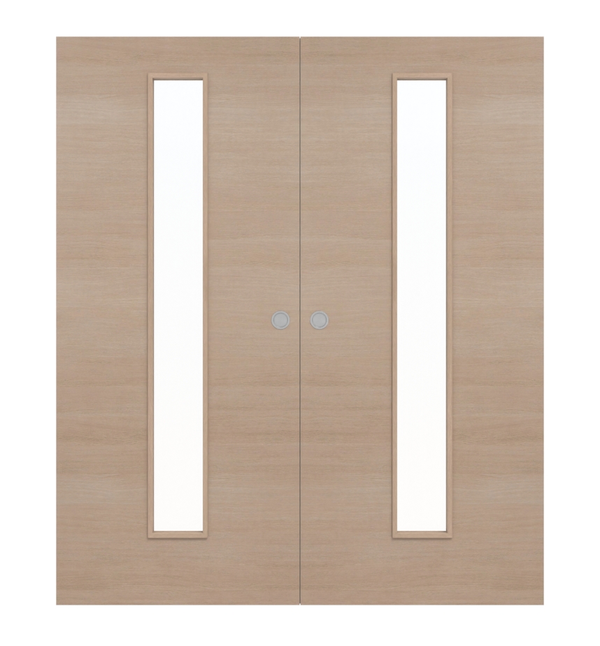 Na środku obu skrzydeł drzwiowych cienki pas świetlny zdobi gładką powierzchnię CPL. Ożywia ją atrakcyjny dekor drewna w kolorze Pinia Jasna Krzyżowa. Jasność i przejrzystość sprawiają, że wnętrze mieszkania wydaje się otwarte i przestronne.