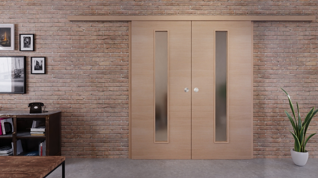 Drzwi przesuwne z dwoma skrzydłami w jasnej sosnie Cross PiC 11 od Westag: