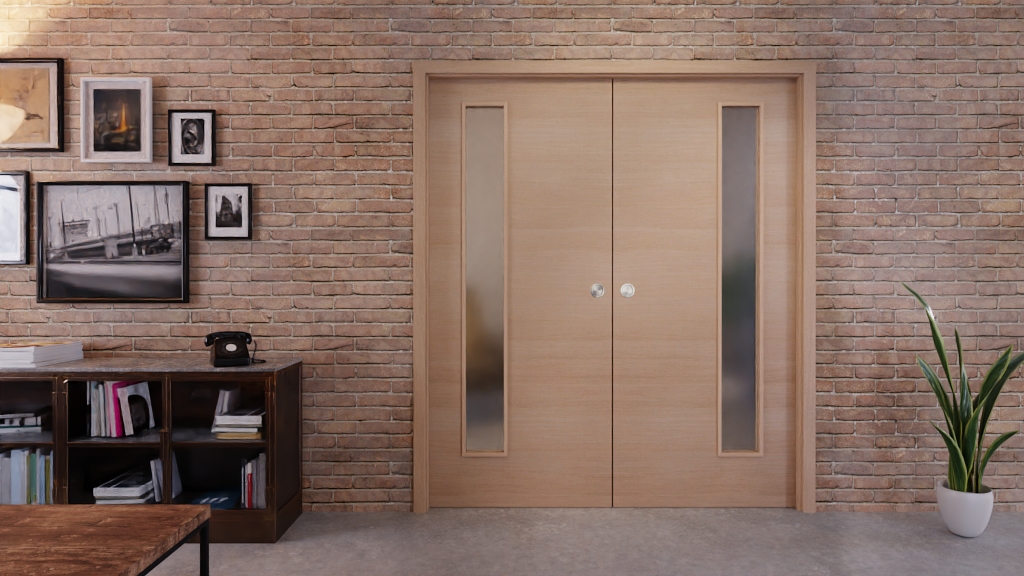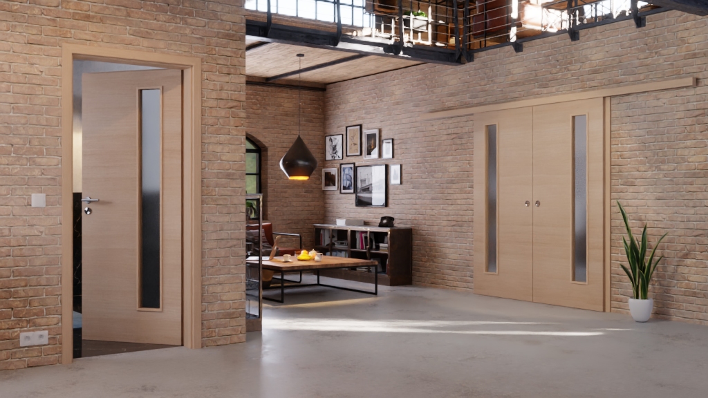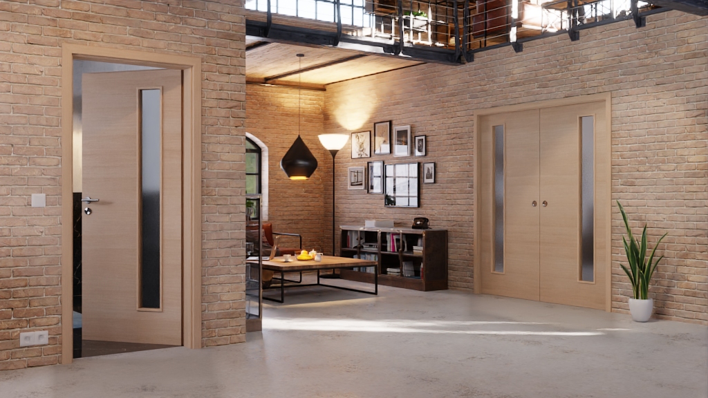 Boki skrzydeł drzwiowych zapewniają przyjemny efekt wizualny w pomieszczeniach mieszkalnych dzięki wąskim pasom świetlnym , przez które wpada światło dzienne. Jasne wykończenie wizualne drewna pinie Cross charakteryzuje gładka powierzchnia CPL.