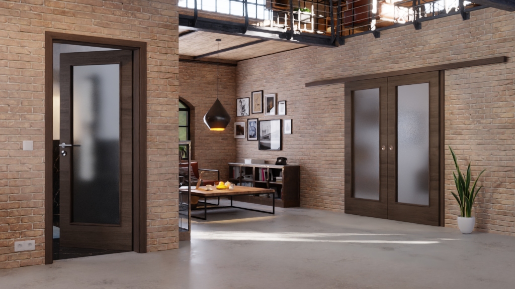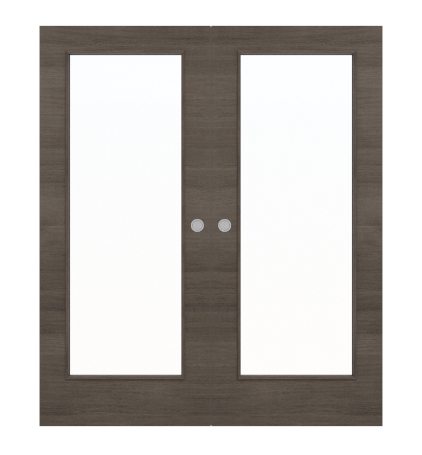 Podwójne drzwi przesuwne charakteryzują się okładziną w kolorze szarym pinie Cross. Ciemne drewniane dekory nadają Twojemu domowi elegancki akcent. Oba skrzydła drzwiowe mają duże okna w kształcie prostokąta.