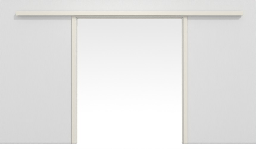 System podwójnych drzwi przesuwnych w klasycznej bieli RAL 9010 marki Westag, biegnący przed ścianą: