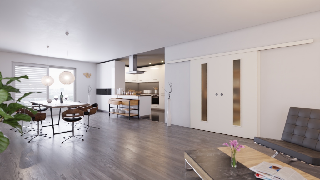 Prawdziwe cudo przestrzeni: Dzięki drzwicom przesuwnym podwójnym z LA-1 w kolorze Uni Biały A 242 PortaLit od firmy Westag zyskujesz więcej miejsca na aranżację swojego wnętrza.