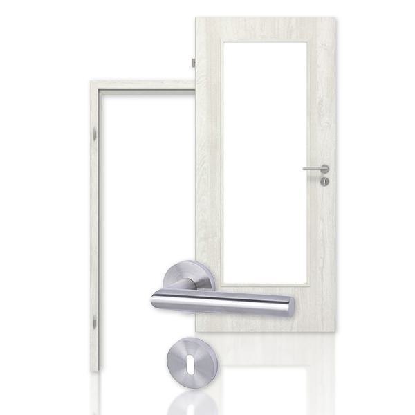 • Zakres dostawy: skrzydło drzwiowe, zamek wielozadaniowy, 2x dwuczęściowe zawiasy, szklenie