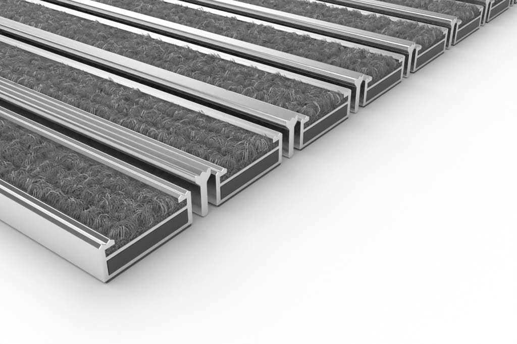 Te maty wejściowe składają się z pojedynczych profili aluminiowych, które są połączone ze sobą stalowymi linkami. Podczas produkcji zwraca się uwagę, aby aluminium i konstrukcja nie przesuwały się pod stałym obciążeniem. Dzięki temu są odporne na skręcanie. Ogólnie maty są wygłuszające kroki i przeznaczone do dużych obciążeń. Maty aluminiowe są wpuszczane w podłogę, dzięki czemu są bezbarierowe. Istnieje również możliwość wbudowania w maty systemów prowadzących dla osób niedowidzących. Maty aluminiowe różnią się między sobą wysokością, szerokością i głębokością.