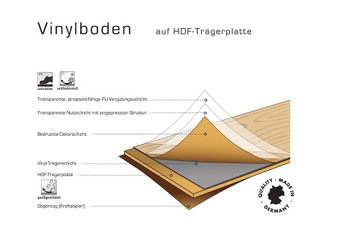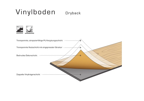 Winyl klik jest zbudowany podobnie jak laminat. Warstwa winylowa montowana jest na płycie nośnej z HDF lub MDF. Podłoga może być układana w systemie pływającym. Winyl dryback przeznaczony jest do montażu na klej i charakteryzuje się niską wysokością, dzięki czemu idealnie nadaje się do renowacji. Podłoga dryback składa się z podwójnej warstwy winylu oraz dekoru. Podłogi winylowe z materiału pełnego, winyl klik oraz winyl dryback posiadają warstwę użytkową jako zabezpieczenie powierzchni.