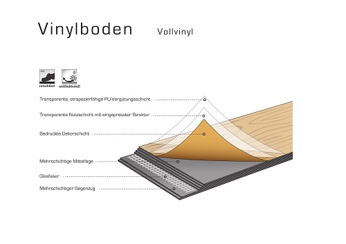 Podłoga winylowa z materiału pełnego składa się wyłącznie z winylu i nie zawiera żadnych elementów drewnianych, co oznacza, że także warstwa nośna wykonana jest z winylu. Zaletą deski z litego winylu jest wodoodporność, ponieważ w przeciwieństwie do drewna winyl nie pęcznieje pod wpływem wody i dlatego może być bez problemu stosowany w łazience i kuchni. Zazwyczaj podłoga winylowa z materiału pełnego jest niższa niż podłogi z nośnikiem HDF (płyta pilśniowa o wysokiej gęstości) lub MDF (płyta pilśniowa o średniej gęstości), dzięki czemu świetnie sprawdza się przy renowacjach. Podłoga z litego winylu jest stabilizowana przez warstwę przeciwprężną i w wielu przypadkach wyposażona w połączenie na klik.
