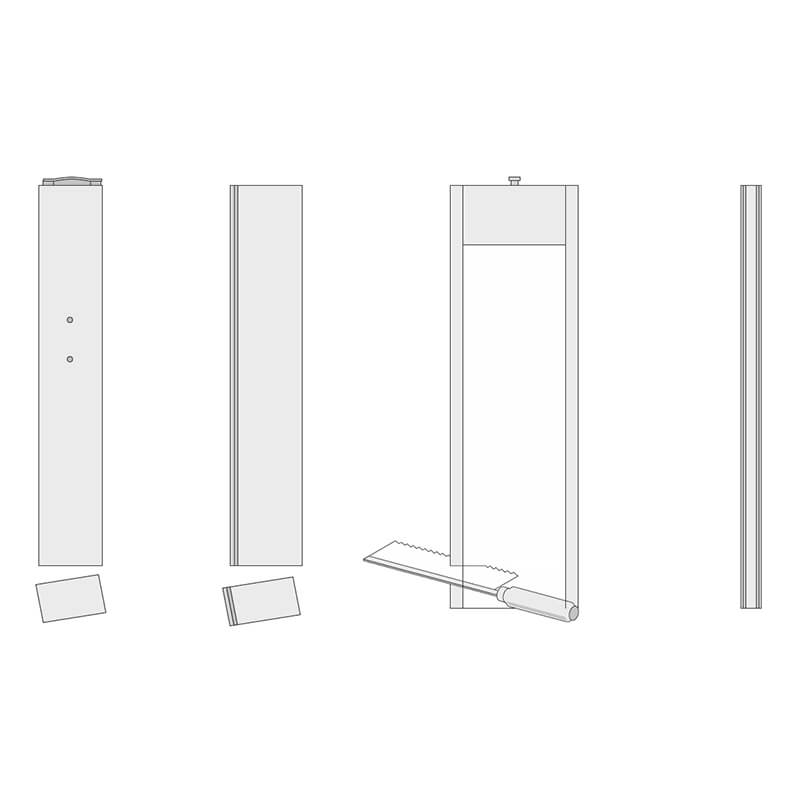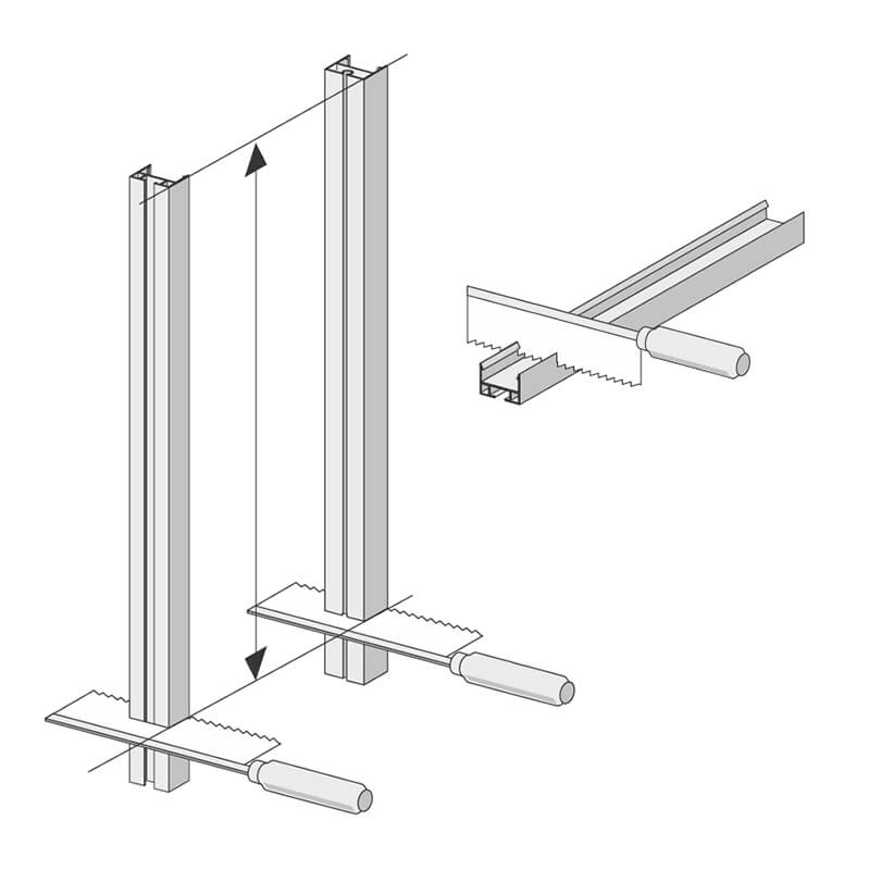 Lamele można skrócić i dopasować do indywidualnych warunków. Przytnij lamele, półlamele oraz listwy przegubowe na odpowiednią długość. Skróć również lamelę z zamkiem. Również tutaj należy uwzględnić wymagane odjęcia wysokości, aby drzwi pasowały do otworu drzwiowego. Do lameli z szybami dołączone są listwy końcowe, które należy przykleić na dolnym końcu lameli.