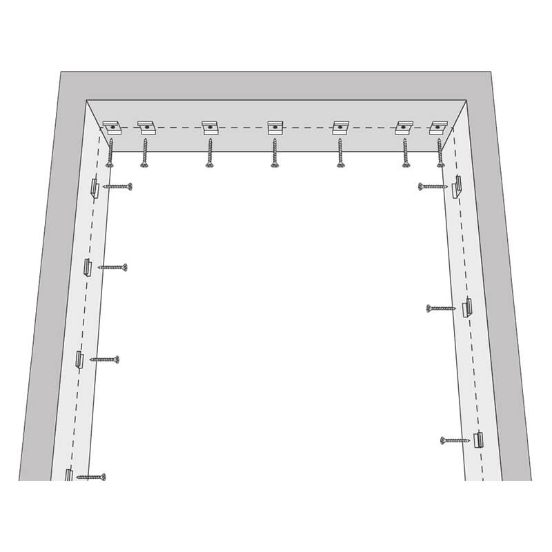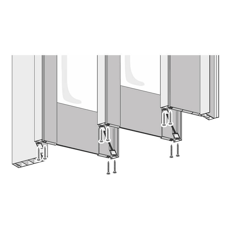 Klipsy utrzymują boczne prowadnice i prowadnicę ślizgową drzwi harmonijkowych. Klipsy przykręca się do ościeżnicy lub ściany. Wymagane odległości znajdziesz w instrukcji montażu swojego modelu. Zazwyczaj odległości klipsów dla górnej prowadnicy ślizgowej są mniejsze, ponieważ ta prowadnica utrzymuje ciężar drzwi. Zwróć uwagę, które klipsy należy zamontować po stronie zamka.