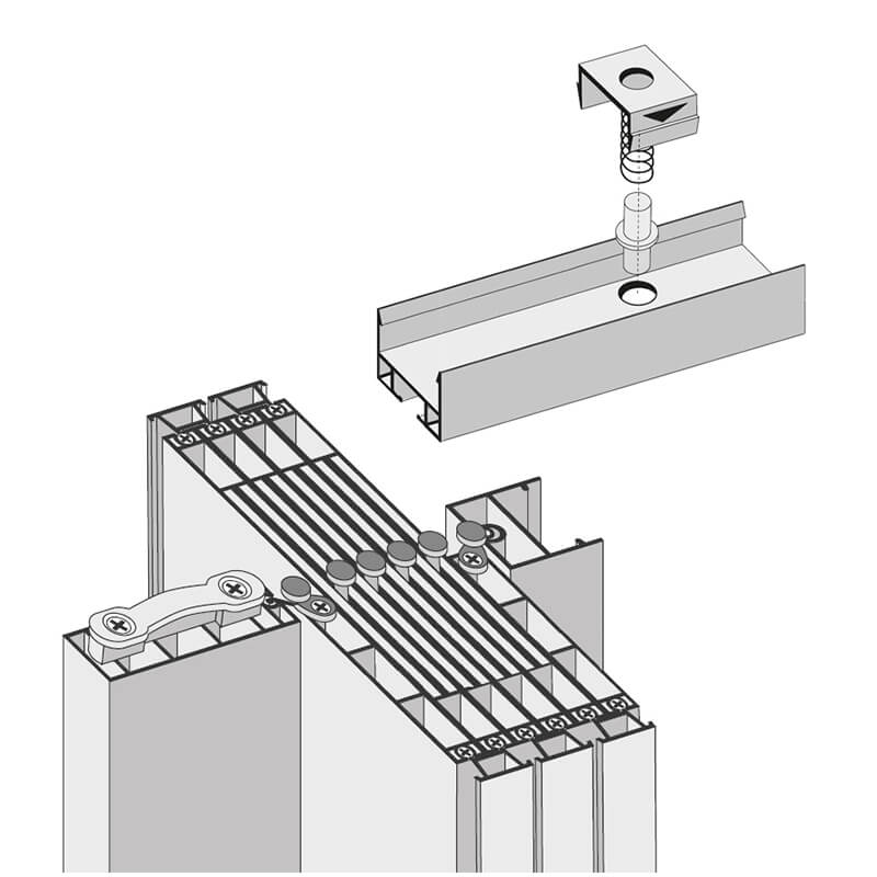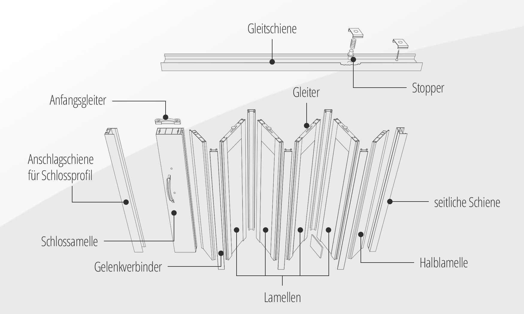Drzwi harmonijkowe z konstrukcją wiszącą montuje się na prowadnicy ślizgowej. W tym celu należy zamocować ślizgacze do lameli. Ślizgacz początkowy należy przykręcić do lameli z zamkiem. Półlamele wyposażone są w kątowe ślizgacze.