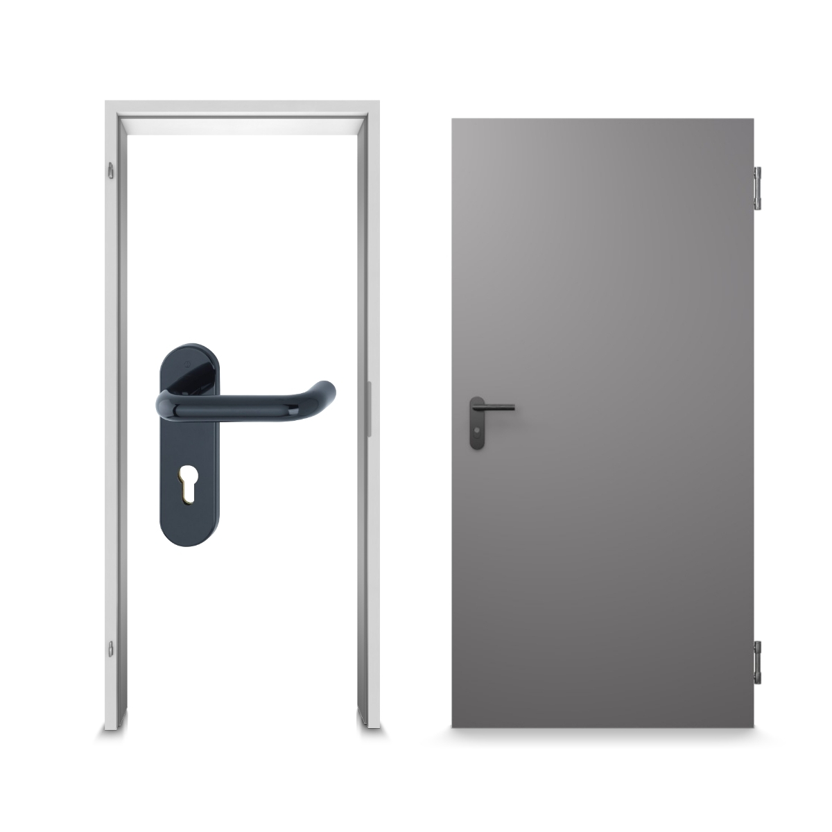 Drzwi są szczególnie stabilne dzięki dwuwarstwowej, 40 mm grubej płycie drzwiowej z 3-stronnym grubym falcem. Wykonane są z ocynkowanej blachy stalowej o grubości 0,6 mm i w pełni klejonego wkładu w formie plastra miodu. W zestawie znajduje się ościeżnica, zamek na klucz piórowy oraz błyszcząco ocynkowane zawiasy, które są mocno przykręcone do wkładek wzmacniających.