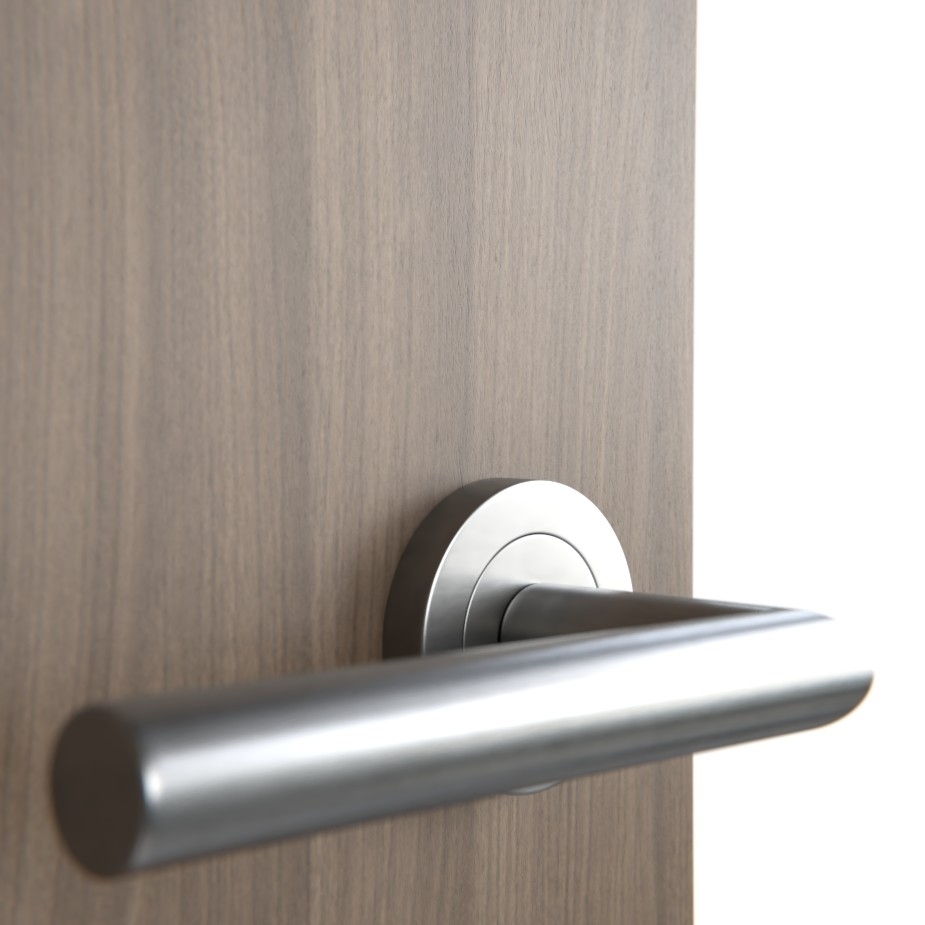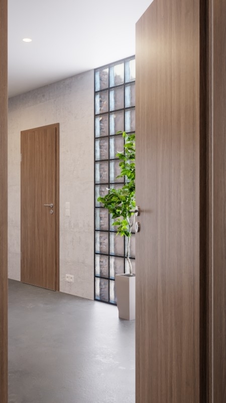 Dzięki jednolitej dekoracyjnej powierzchni drzwi i ościeżnicy uzyskuje się harmonijny wygląd całości. Subtelna klamka z satynowaną powierzchnią ze stali nierdzewnej stanowi idealne uzupełnienie dla elementów drzwiowych.