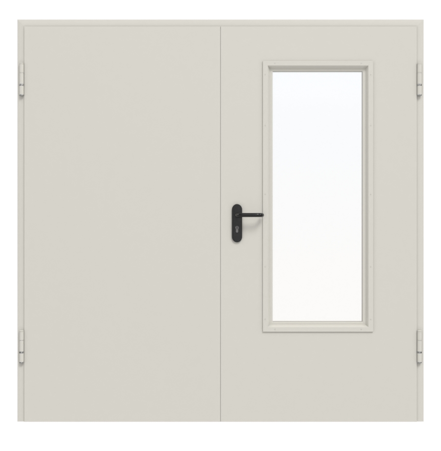Drzwi stalowe mają grubość 65 mm i składają się z dwuściennej, konstrukcji warstwowej klejonej na całej powierzchni oraz dużego przeszklenia w aktywnym skrzydle. Powłoka została zagruntowana w odcieniu szaro-białym RAL 9002. Ponadto drzwi wyposażone są w zawiasy konstrukcyjne z łożyskami kulkowymi.