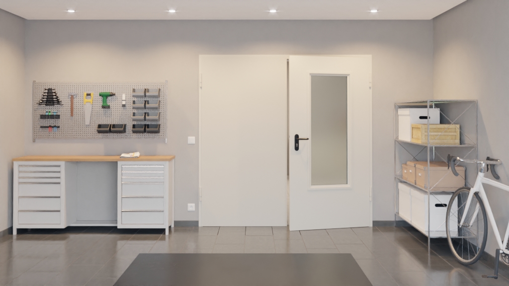 Ten zestaw drzwi wewnętrznych od Hörmann obejmuje stalowe drzwi wielofunkcyjne D65-2 OD LA-B3, ościeżnicę DryFix oraz klamkę:
