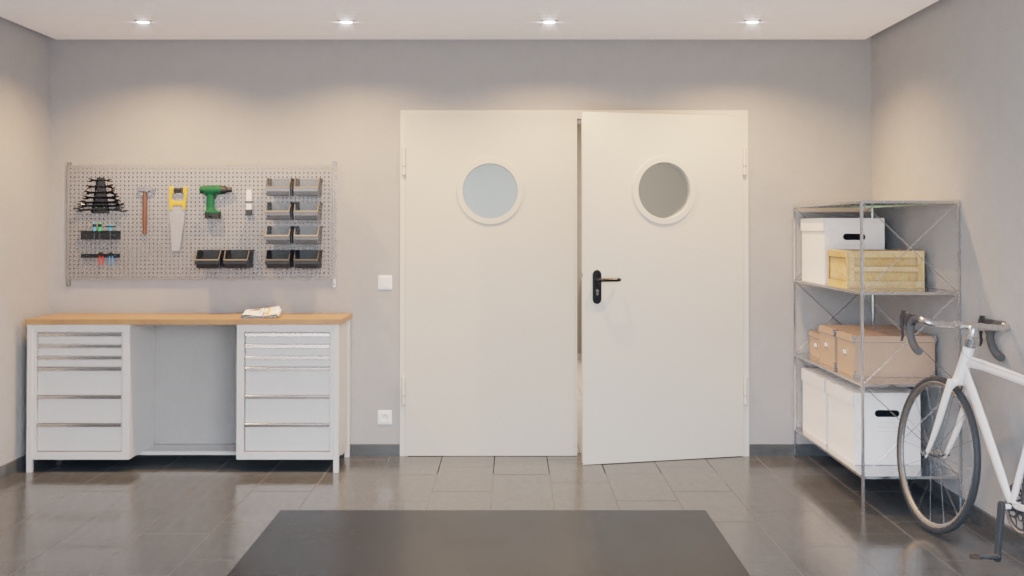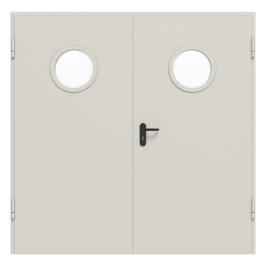 Ten zestaw drzwi wewnętrznych od Hörmann składa się z stalowych drzwi wielofunkcyjnych D65-2 OD LA z oknem, ościeżnicy DryFix oraz klamki: