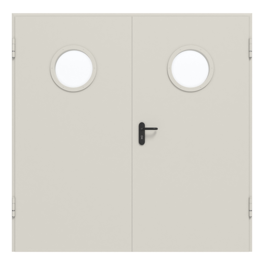 Drzwi stalowe mają grubość 65 mm i składają się z dwuściennej, konstrukcji warstwowej klejonej na całej powierzchni. Powłoka została zagruntowana w odcieniu szaro-białym RAL 9002. Ponadto drzwi wyposażone są w zawiasy konstrukcyjne z łożyskami kulkowymi oraz dwa zaokrąglone przeszklenia.