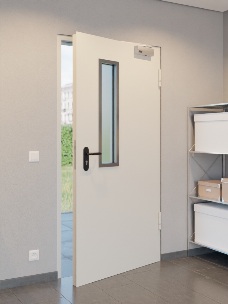 Drzwi przeciwpożarowe od Hörmann, łączące wnętrze domu z przestrzenią zewnętrzną: