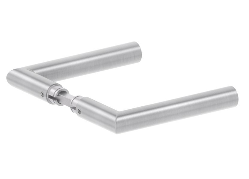 Kontrastowy design łączy w sobie prostokątną skrzynkę zamka z zaokrąglonym uchwytem w kształcie litery L. Powierzchnia z matowej stali nierdzewnej podkreśla nowoczesny design.