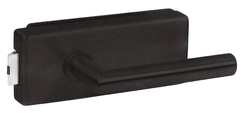 Zestaw okuć drzwi szklanych Palma od Südmetall w czarnym stali jest wyposażony w cichą klapkę: